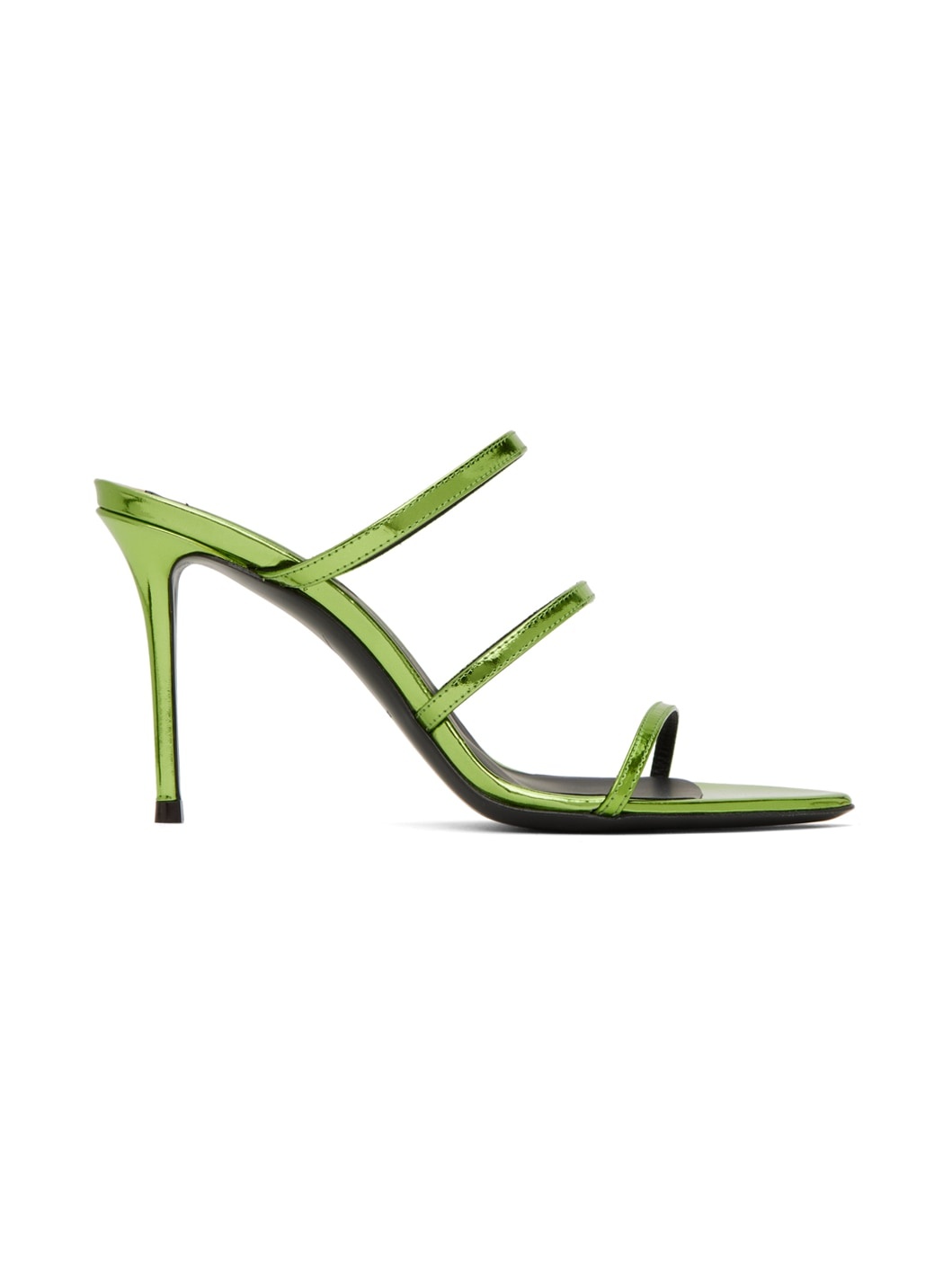Patent leather slip-on heeled sandals in metallic green. · Open almond toe · Logo printed at padded footbed · Covered stiletto heel with rubber injection · Leather sole · Heel: H3.5 in Supplier color: Green lizard Leather. Made in Italy 231266F125036