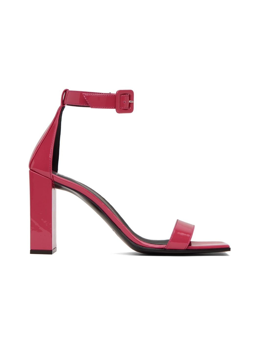 Patent leather heeled sandals in pink. · Open square toe · Adjustable pin-buckle ankle strap · Logo printed at padded footbed · Covered block heel with rubber injection · Leather sole · Heel: H3.5 in Supplier color: Fiesta Leather. Made in Italy 231266F125032