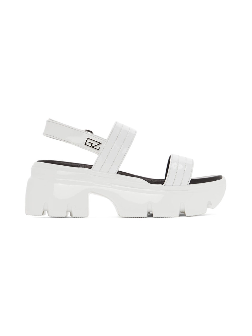 Patent leather sandals in white. Tonal topstitching at vamp. · Logo embossed at open round toe · Velcro slingback strap with logo hardware at outer side · Silver-tone logo stamp at black leather footbed · Platform rubber midsole · Treaded rubber outsole · Heel: H3 in · Platform: H2 in Supplier color: White Upper: leather. Sole: rubber. Made in Italy 221266F124022