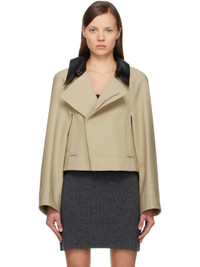 Cotton- and wool-blend drill peacoat. · Hook-eye fastening at grained lambskin spread collar · Offset concealed zip closure · Seam pockets · Cropped hem · Raglan sleeves · Logo embroidered at cuff · Full plain-woven cotton lining Supplier color: Beige Body: 76% cotton, 24% wool. Trim: 100% lambskin. Lining: 100% cotton. Made in Italy 252278F063000