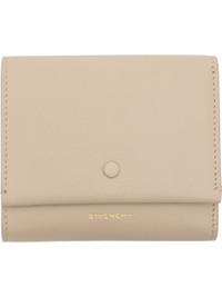 Grained calfskin trifold wallet. · Logo stamp at face · Logo embossed at back face · Press-stud closure · Five card slots at interior · One note slot · Press-stud coin compartment · H3.5" x W4" x D1.75" Supplier color: Natural beige Calfskin. Made in Italy 252278F040003
