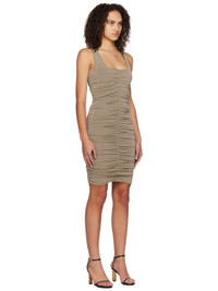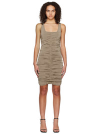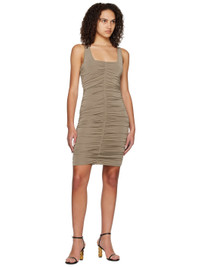 Knit stretch viscose-blend dress. Ruching and embroidered logo pattern throughout. · Off-the-shoulder construction · Square neckline · Fixed spaghetti shoulder straps · Concealed zip closure with hook-eye fastening at back · Full mesh lining Supplier color: Beige Body: 85% viscose, 12% polyamide, 3% elastane. Lining: 92% polyamide, 8% elastane. Made in Italy 231278F052002