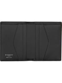 Grained calfskin bifold card holder. · Logo stamp at face · Four card slots and two patch pockets at interior · One note slot · H4.25" x W3.5" x D1" Supplier color: Black Calfskin. Made in Italy 252278M163007
