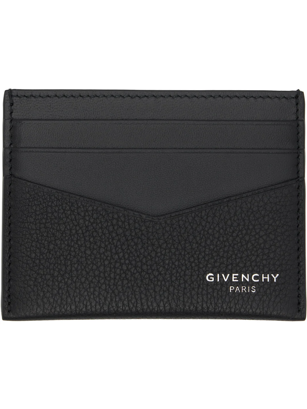 Grained and buffed calfskin card holder. · Logo stamp at face · Six card slots · Central note slot · H3.25" x W4.25" Supplier color: Black Calfskin. Made in Italy 252278M163006