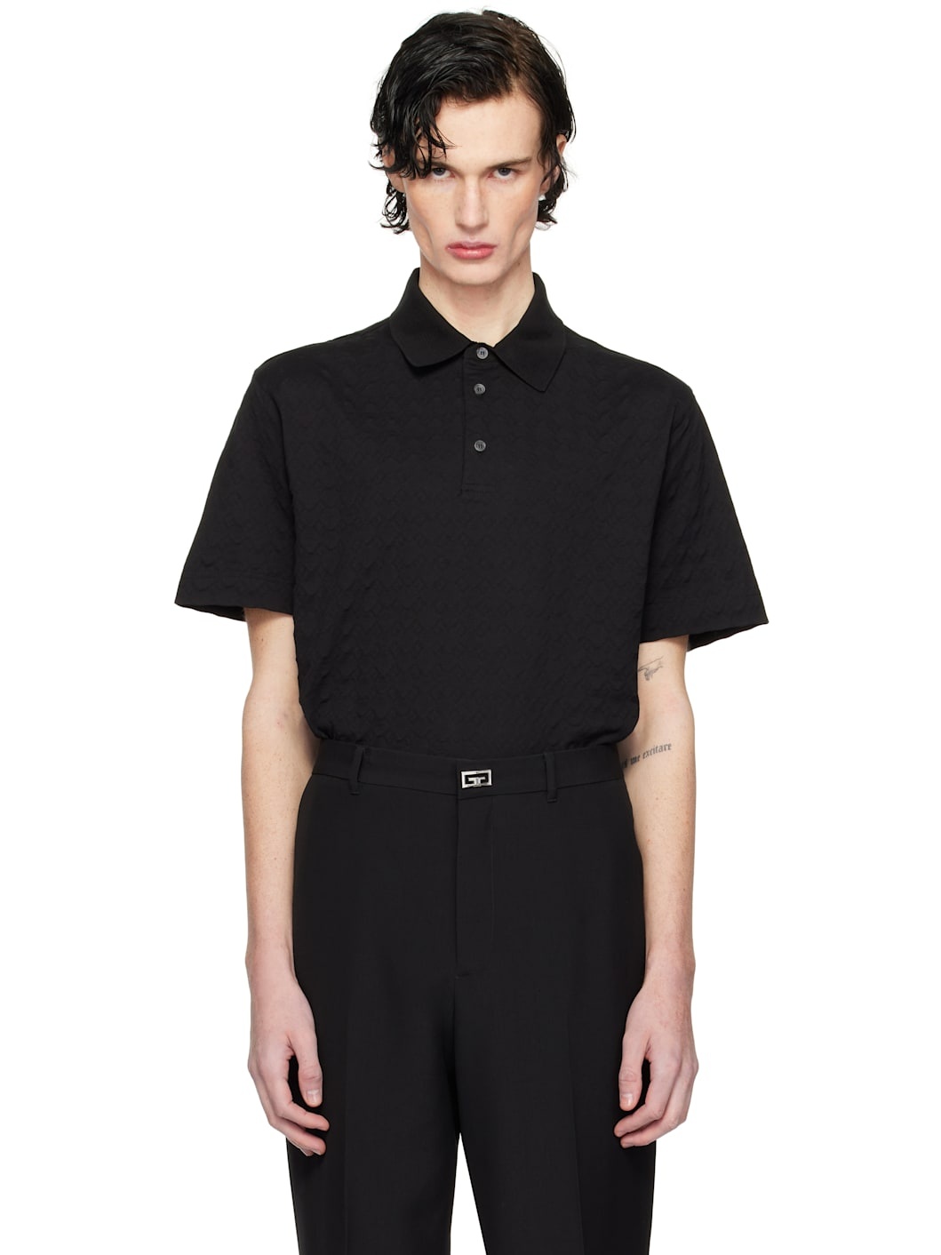 Cotton pique polo. Jacquard logo pattern throughout. · Rib-knit spread collar · Three-button placket · Tennis-tail hem Supplier color: Black 100% cotton. Made in Italy 251278M212003