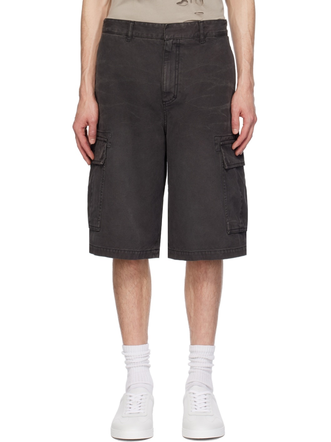 Cotton canvas shorts. Fading throughout. · Belt loops · Concealed adjustable button tabs at waistband · Four-pocket styling · Zip-fly · Logo-embroidered cargo pocket at outseams Supplier color: Black 100% cotton. Made in Italy 241278M193003