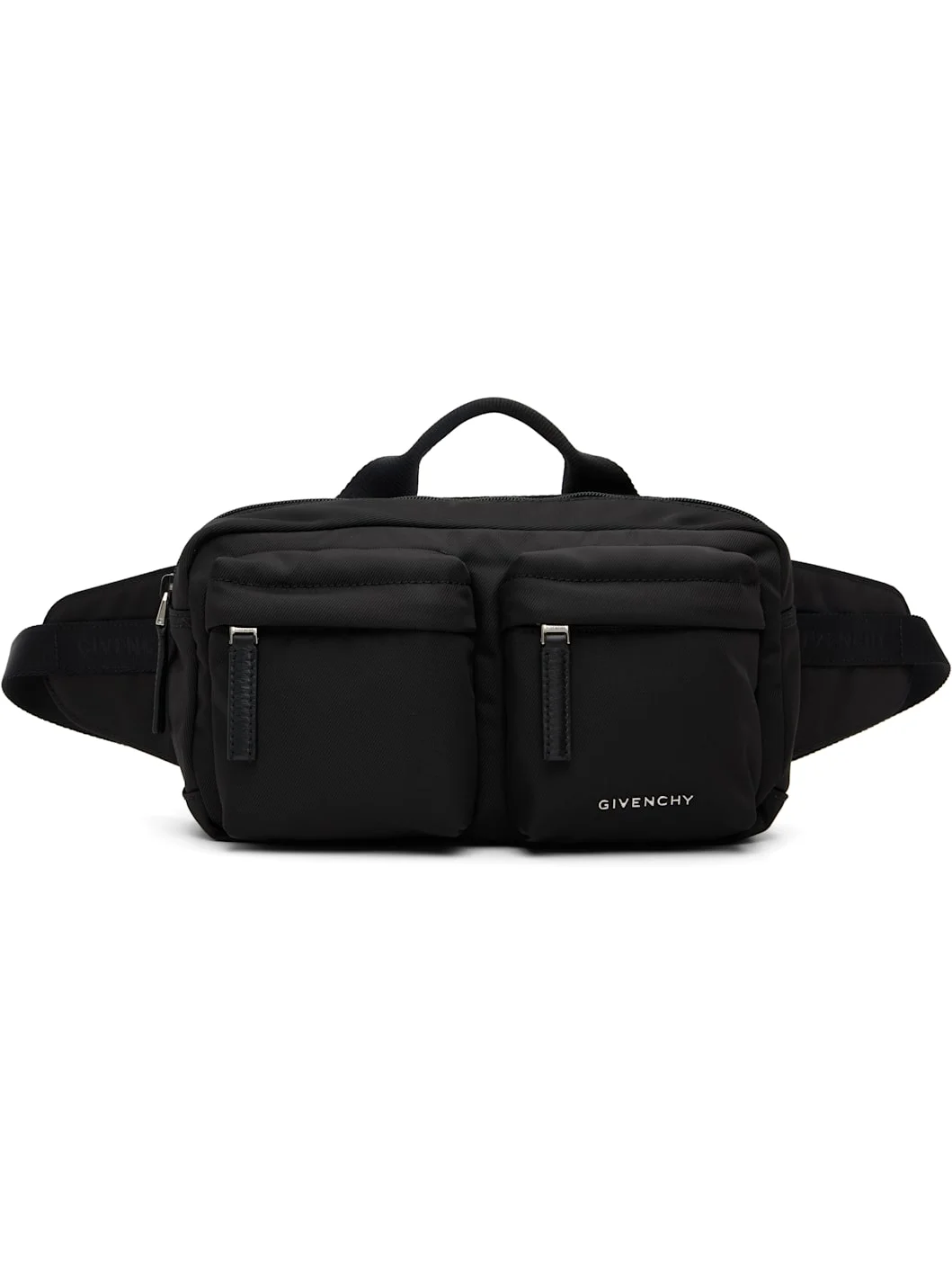 Nylon twill belt bag. · Fixed carry handle · Adjustable press-release crossbody strap · Zip pockets and logo hardware at face · Zip closure · Satin lining · H6.5" x W11" x D4.5" Supplier color: Black Textile. Made in Italy 261278M170002