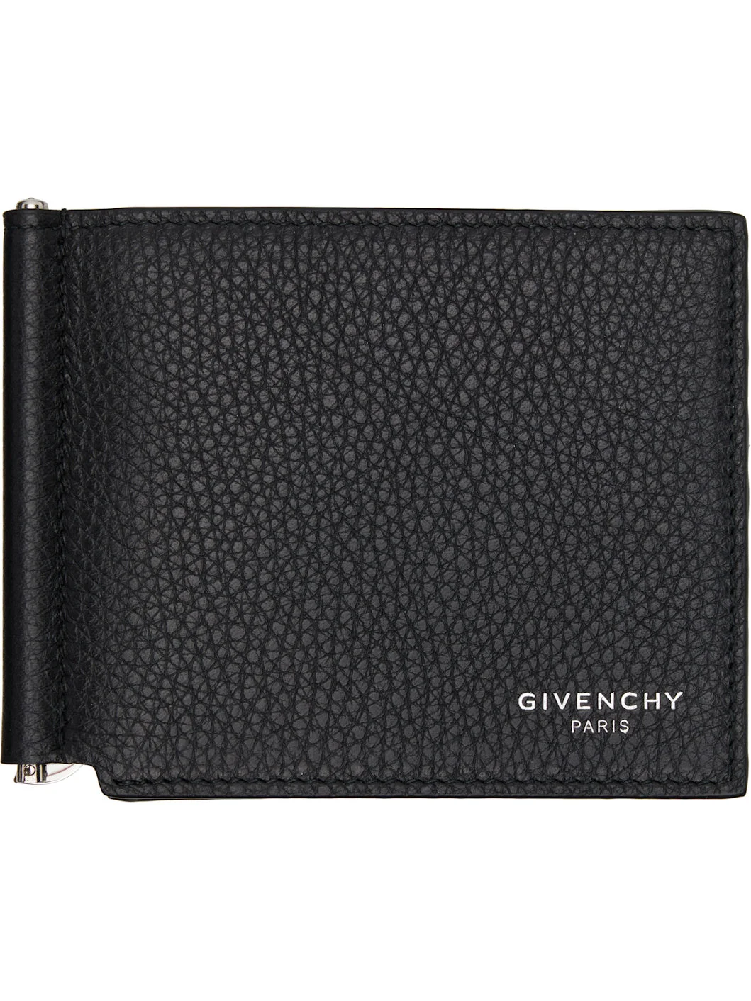 Grained calfskin bifold wallet. · Logo stamp at face · Money clip at interior · Eight card slots and two patch pockets · H3.5" x W4.5" Supplier color: Black Calfskin. Made in Italy 261278M164006