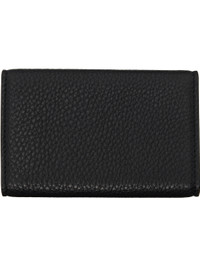 Grained calfskin trifold card holder. · Logo stamp at face · Press-stud closure · Six lobster clasps at interior · One card slot · H2.75" x W4.25" x D1" Supplier color: Black Calfskin. Made in Italy 261278M163008