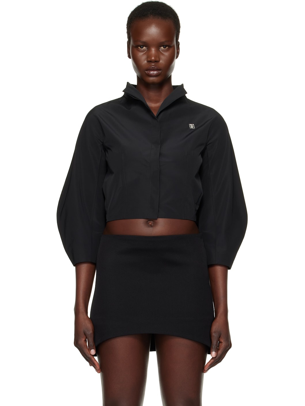 Cotton poplin shirt. · Mock neck · Concealed button closure · Silver-tone logo hardware at chest · Cropped hem · Saddle shoulders · Balloon sleeves · Gathering at back hem Supplier color: Black 100% cotton. Made in Italy 251278F109006