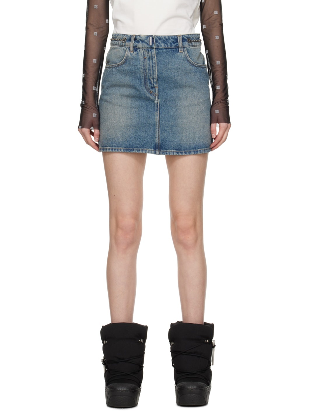 Non-stretch denim skirt. Fading and subtle distressing throughout. · Belt loops · Logo plaque and chain link at waistband · Four-pocket styling · Zip-fly · Logo hardware at back · Contrast stitching in tan Supplier color: Medium blue 100% cotton. Made in Italy 241278F090002
