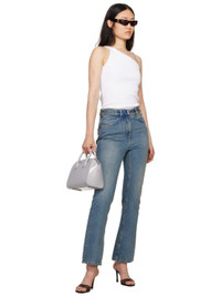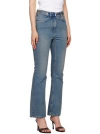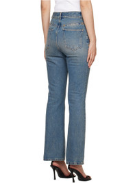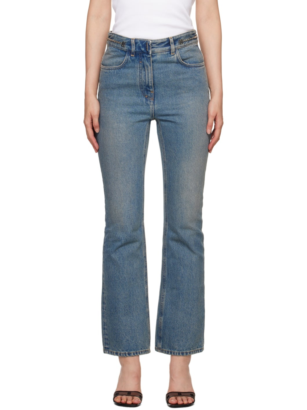 Non-stretch denim jeans. Fading and subtle distressing throughout. · Belt loops · Logo plaque and chain link at waistband · Four-pocket styling · Zip-fly · Logo hardware at back · Contrast stitching in tan Supplier color: Medium blue 100% cotton. Made in Italy 241278F069006