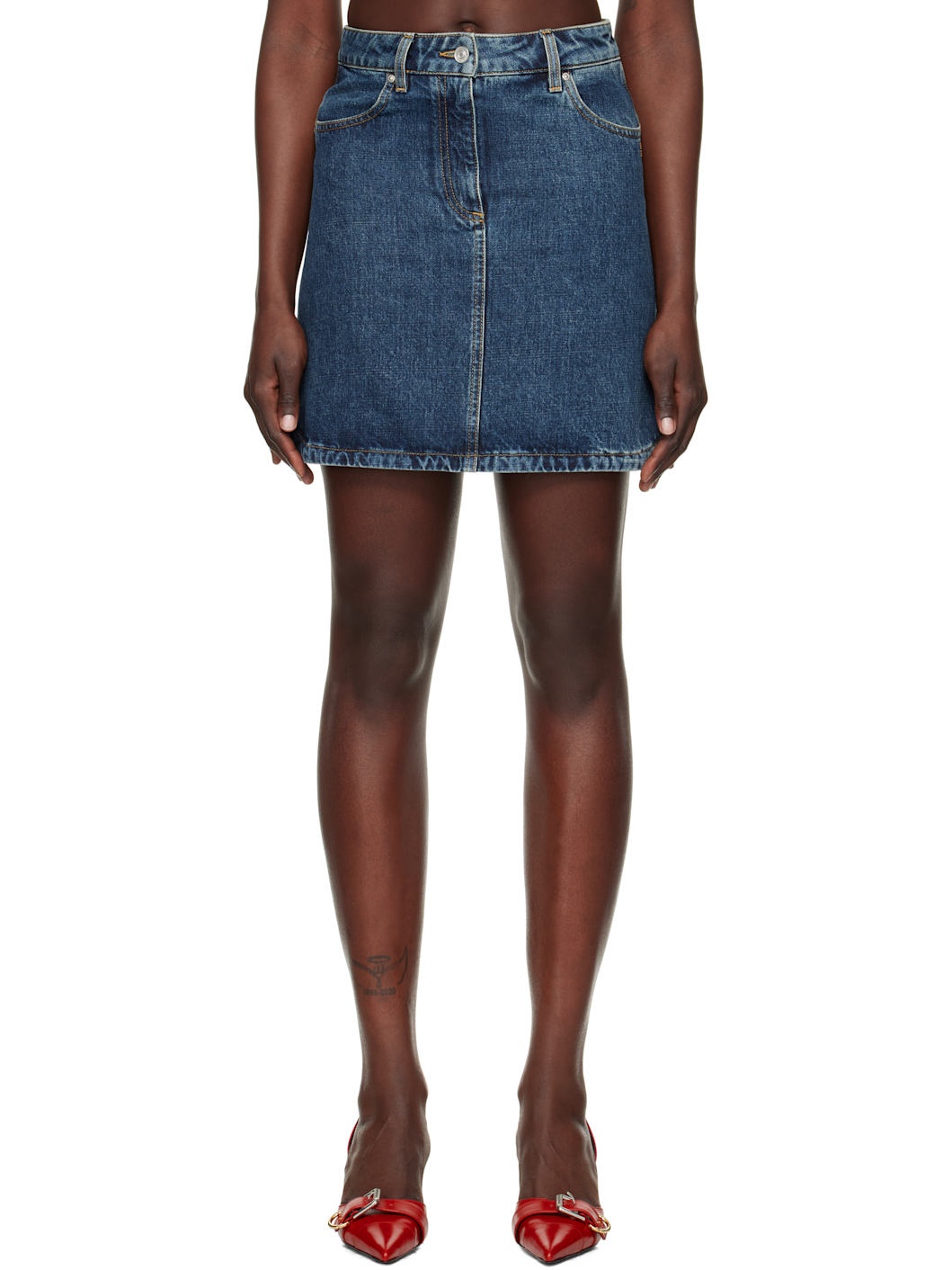 Non-stretch denim miniskirt. Fading throughout. · Belt loops · Four-pocket styling · Zip fly · Logo-engraved silver-tone hardware · Contrast stitching in tan Supplier color: Medium blue 100% cotton. Made in Romania 251278F090006