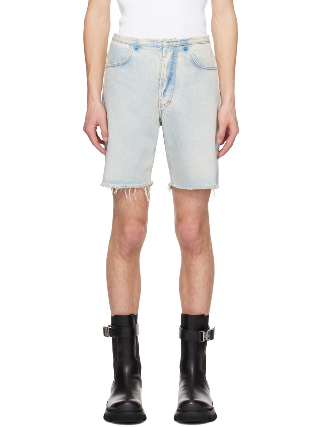 Non-stretch denim shorts. Fading throughout. · Raw edge at waistband and cuffs · Four-pocket styling · Button-fly · Logo hardware at back pocket · Contrast stitching in yellow Supplier color: Pale blue