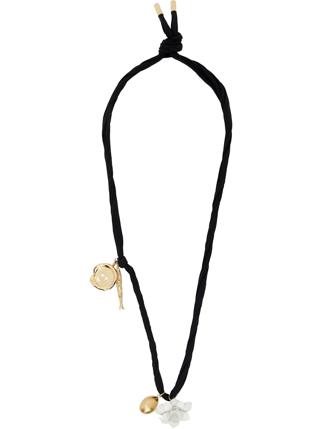 Silk satin cord necklace in black. · Charms at drop and side · Self-tie fastening · Gold-tone brass hardware · L38" Supplier color: Golden yellow Textile, brass. Made in Italy 261278F023000