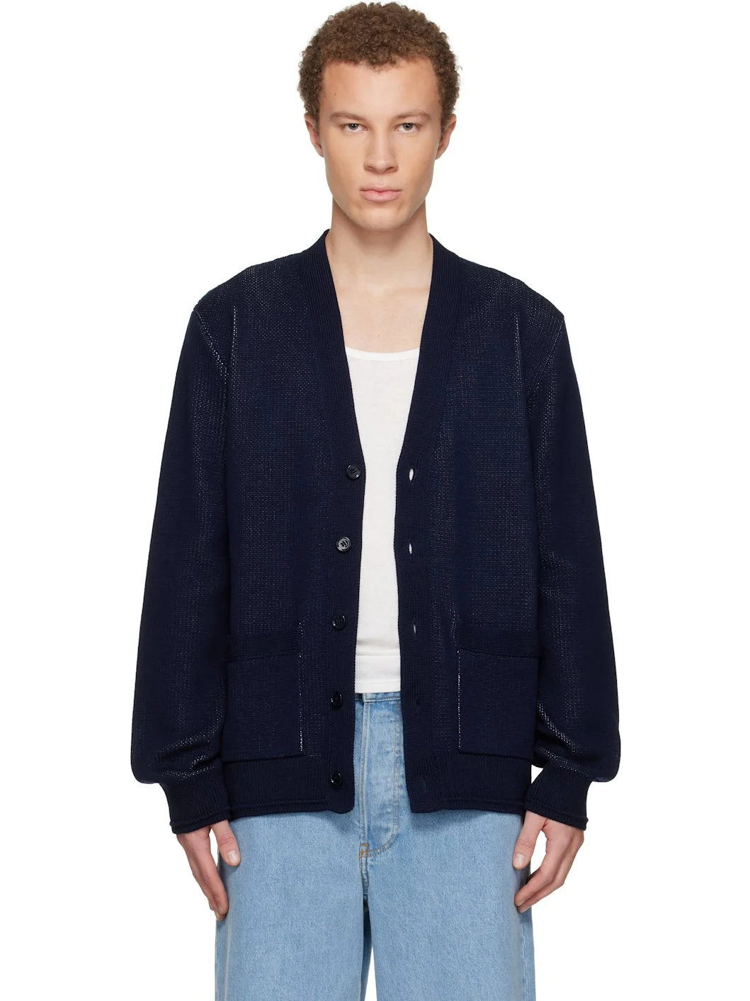 Knit cotton cardigan. · Rib-knit Y-neck, hem, and cuffs · Button closure · Patch pockets at front · Dropped shoulders · Logo embroidered at back Supplier color: Dark navy 100% cotton. Made in Italy 261278M200000
