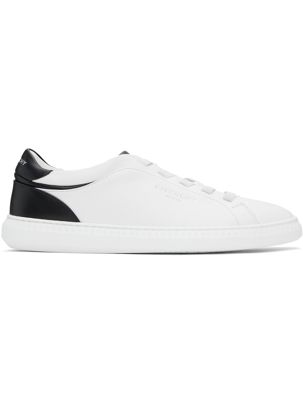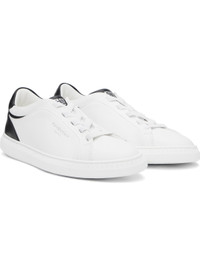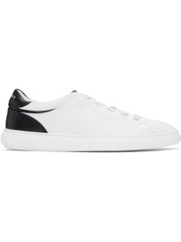 Low-top buffed calfskin slip-on sneakers in white. - Elasticized lace-up closure - Logo stamp at tongue, heel tab, and outer side - Padded tongue and collar - Suede and buffed goatskin lining - Logo graphic pattern embossed at welt - Logo-treaded rubber sole Supplier color: White/Black