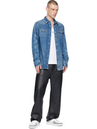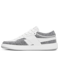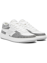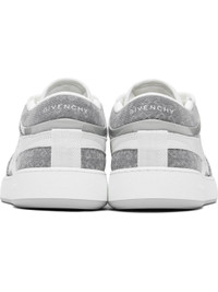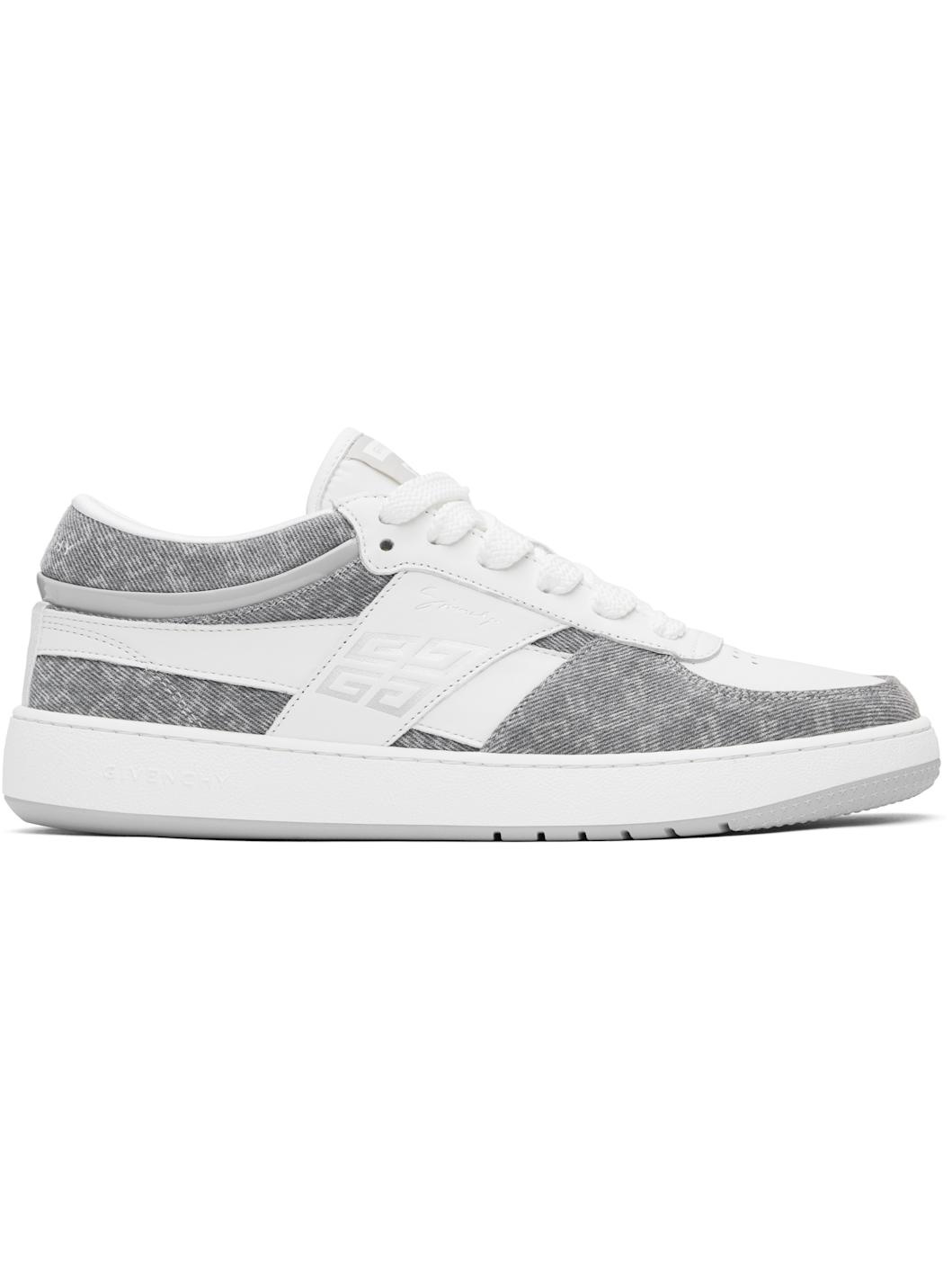 Low-top buffed calfskin and denim sneakers in white and gray. Jacquard logo graphic pattern throughout. · Fading throughout · Perforated detailing at toe · Lace-up closure · Logo printed at padded tongue · Padded collar · Logo stamp at outer side · Logo printed at heel tab · Jersey lining · Treaded rubber sole Supplier color: Grey/White Upper: calfskin, textile. Sole: rubber. Made in Portugal 251278M237005