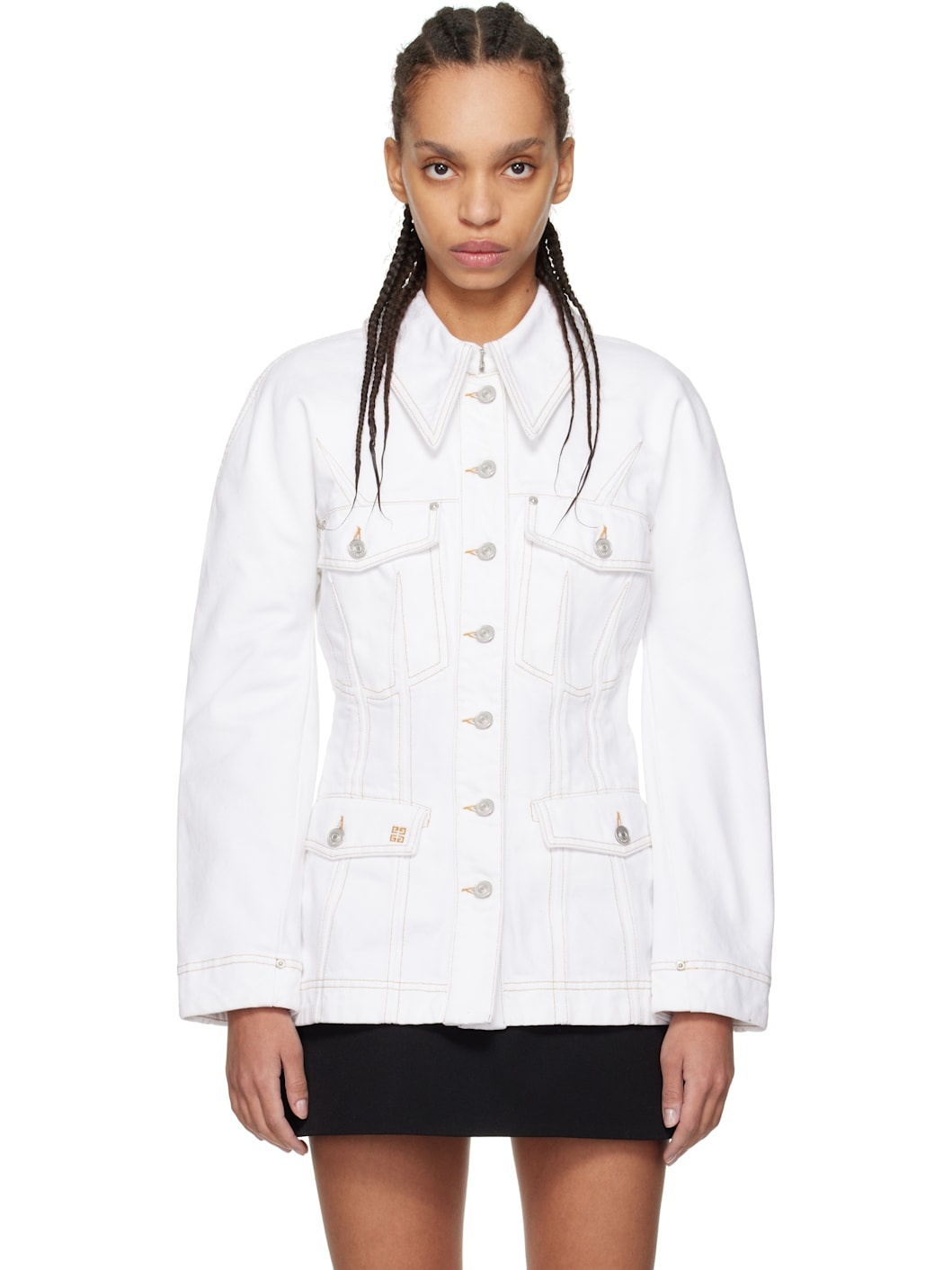 Non-stretch denim jacket. · Hook-eye fastening at spread collar · Button closure · Flap pockets · Darts at front · Logo-engraved silver-tone hardware · Contrast stitching in tan Supplier color: Optic white 100% cotton. Made in Italy 251278F060002