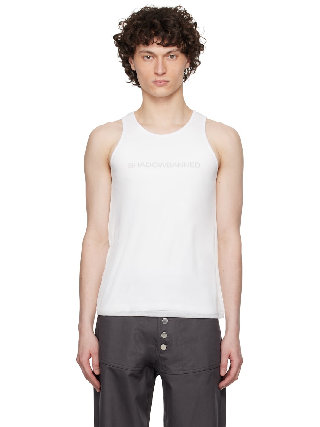 Stretch cotton ribbed jersey tank top. Integrated semi-sheer stretch polyester mesh overlay. · Layered construction · Scoop neck · Text printed at chest · Logo hardware at back collar Supplier color: White Body 1: 95% cotton, 5% elastane. Body 2: 95% polyester, 5% elastane. Made in Portugal 251979M214000