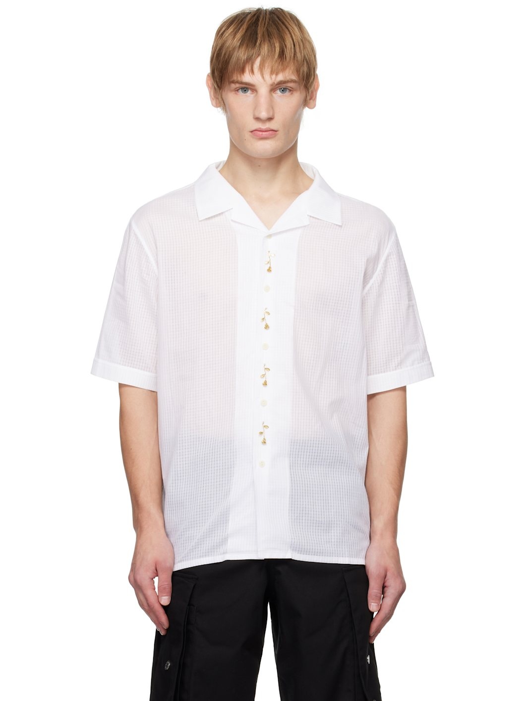 Semi-sheer plain-woven cotton shirt. Check pattern throughout. · Open spread collar · Button closure · Graphic gold-tone hardware at placket Supplier color: White 100% cotton. Made in Hungary 242979M192002