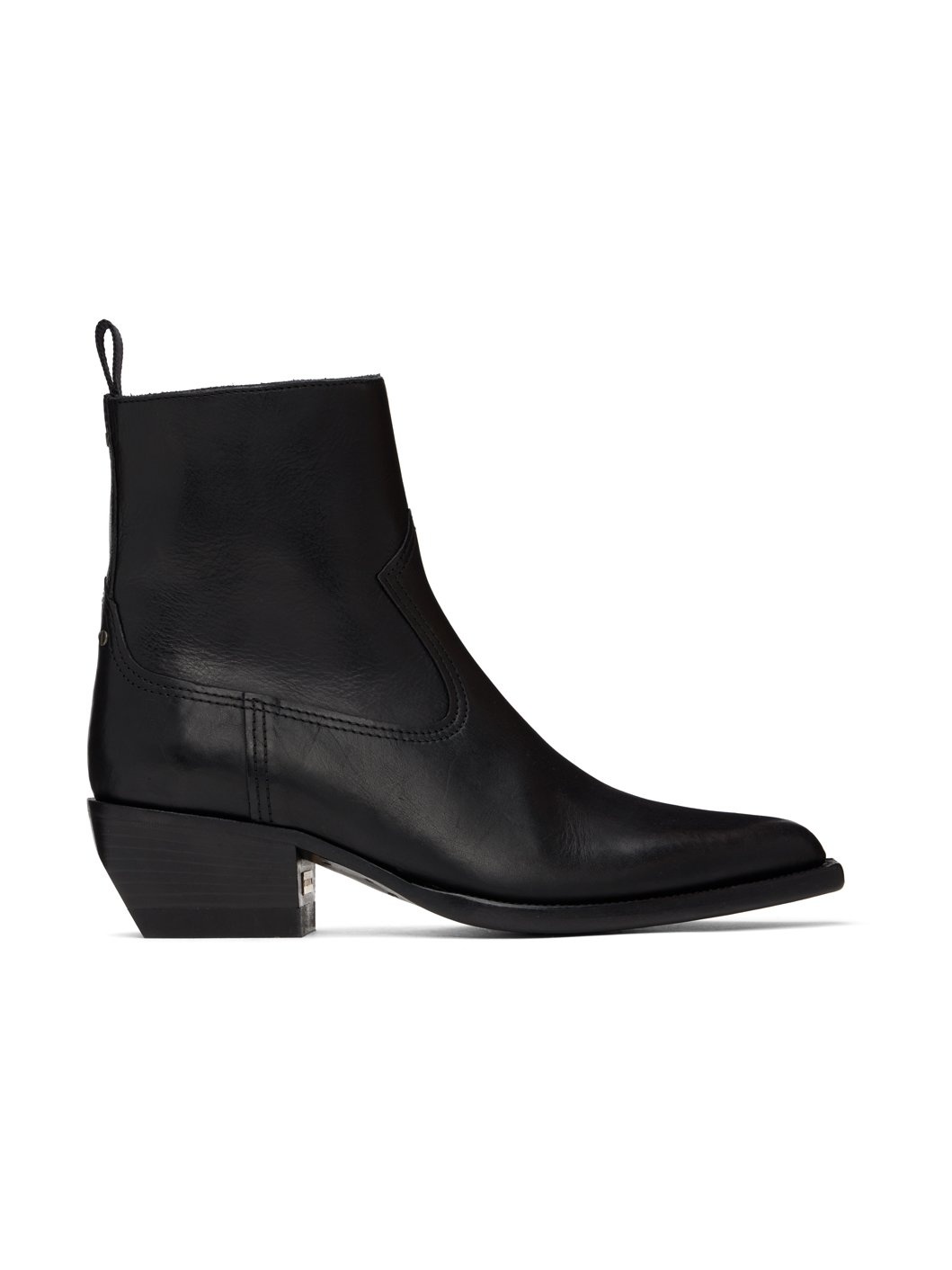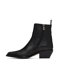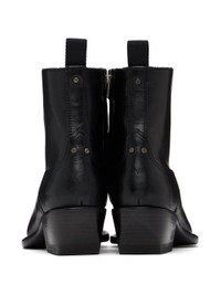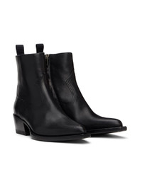Buffed leather ankle boots in black. · Pointed toe · Zip closure at inner side · Pull-loop at collar · Buffed leather lining · Logo plaque at stacked leather block heel · Leather sole with rubber injection · Heel: H2" Supplier color: Black Upper: leather. Sole: rubber, leather. Made in Italy 242264F113002