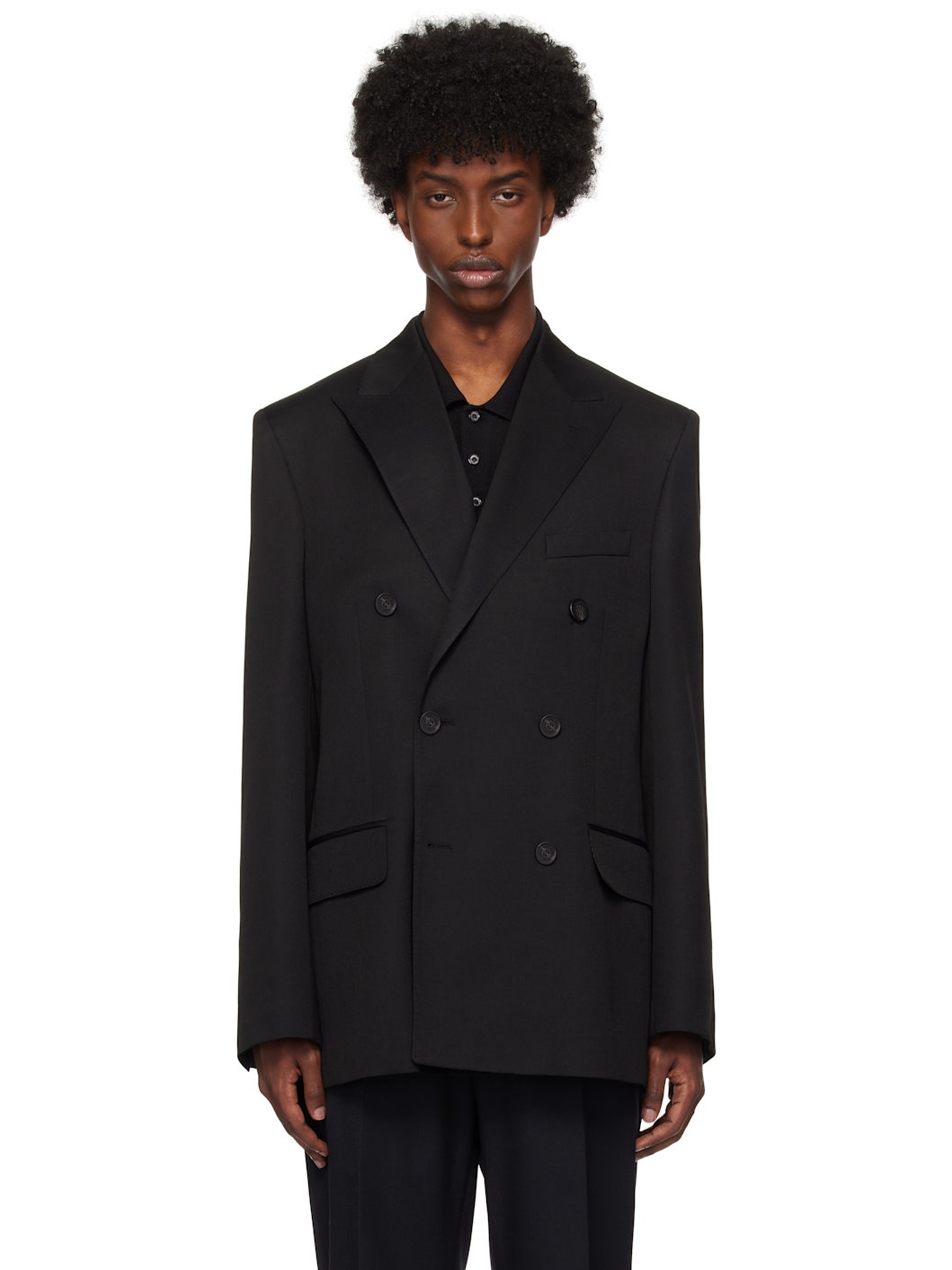 Virgin wool twill blazer. · Peaked lapel · Double-breasted button closure · Welt pocket at chest · Flap pockets · Padded shoulders · Four-button surgeon's cuffs · Logo hardware at back collar · Twin vents at back hem · Welt pockets at interior · Full twill lining Part of the Golden collection. Supplier color: Black Body: 100% virgin wool. Trim: 70% wool, 30% viscose. Lining 1: 55% polyester, 45% viscose. Lining 2: 52% viscose, 48% acetate. Lining 3: 100% viscose. Made in Italy 242264M195000