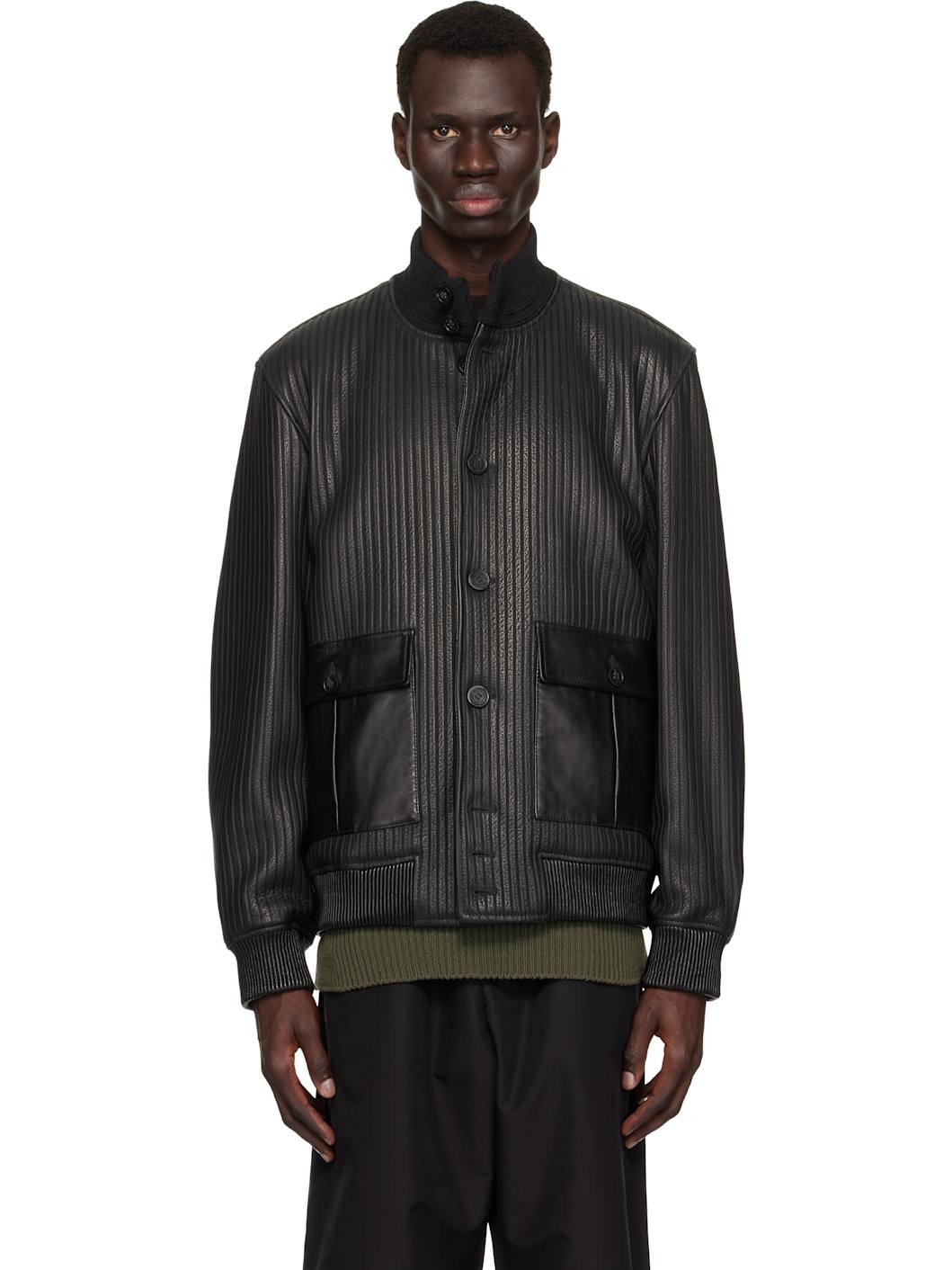Grained sheepskin leather bomber jacket. Stripes embossed throughout. · Rib-knit stand collar · Button closure · Flap pockets · Elasticized hem and cuffs · Logo hardware at back collar · Welt pockets at interior · Full twill lining Supplier color: Black Body: 100% sheepskin. Trim: 48% virgin wool, 47% acrylic, 3% nylon, 2% elastane. Lining 1: 100% polyester. Lining 2: 100% cotton. Made in Italy 251264M181001