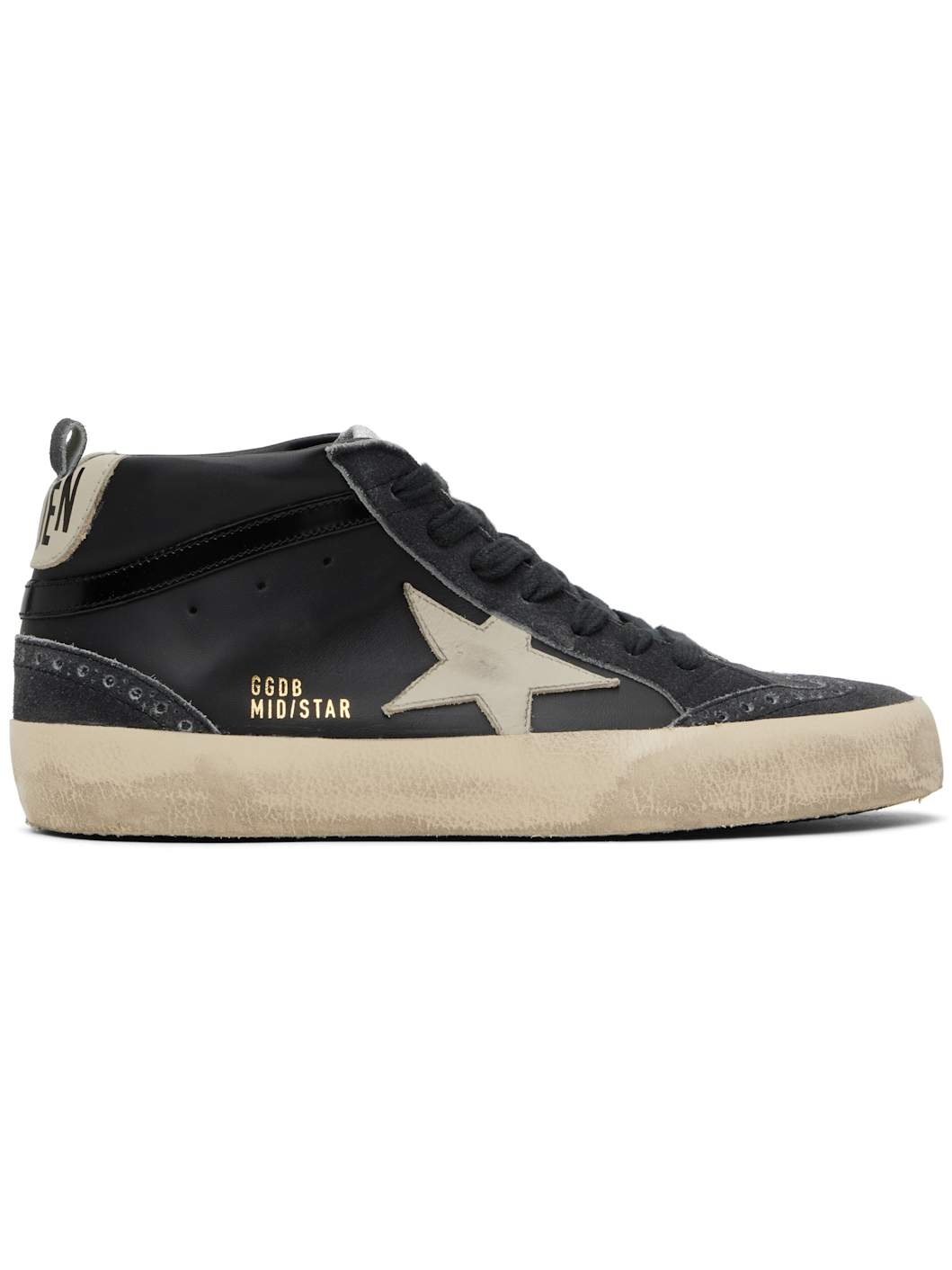 Handcrafted mid-top buffed leather and suede sneakers in black. · Smudging, fading, and perforations throughout · Lace-up closure · Logo patch at tongue · Pull loop at padded collar · Signature star applique at outer side · Logo stamp at outer side · Logo printed at heel tab · Terrycloth, suede, and buffed leather lining · Treaded rubber sole Supplier color: Black/Beige Upper: leather. Sole: rubber. Made in Italy 251264M237031