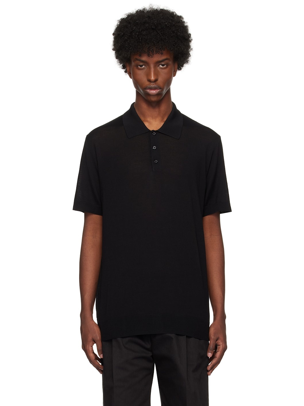 Knit virgin merino wool polo. · Rib-knit spread collar, hem, and cuffs · Three-button placket · Logo hardware at back collar Part of the Golden collection. Supplier color: Black 100% virgin wool. Made in Italy 242264M212000