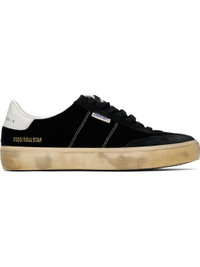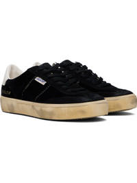 Handcrafted low-top suede and velvet sneakers in black. · Smudging and subtle distressing throughout · Lace-up closure · Logo embossed at padded tongue · Padded collar · Topstitched stripes at sides · Logo flag and stamp at outer side · Logo printed at buffed leather heel tab · Buffed faux-leather and terrycloth lining · Treaded rubber sole Supplier color: Black Upper: textile, leather. Sole: rubber. Made in Italy 252264M237002