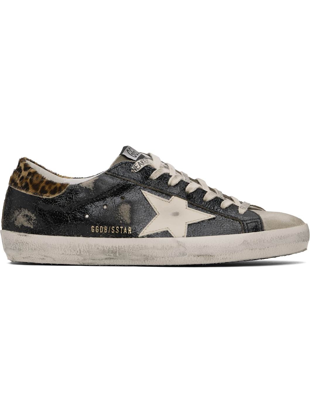 Handcrafted low-top patent leather, suede, and hair-on leather sneakers in black. · Distressing and smudging throughout · Lace-up closure · Logo patch at tongue · Padded collar · Perforated detailing at sides · Signature star applique at outer side · Gold-tone logo stamp at side · Logo stamp at heel tab · Terrycloth, suede, and buffed leather lining · Treaded rubber sole Supplier color: Black/Ivory/Leopard Upper: leather. Sole: rubber. Made in Italy 251264M237066