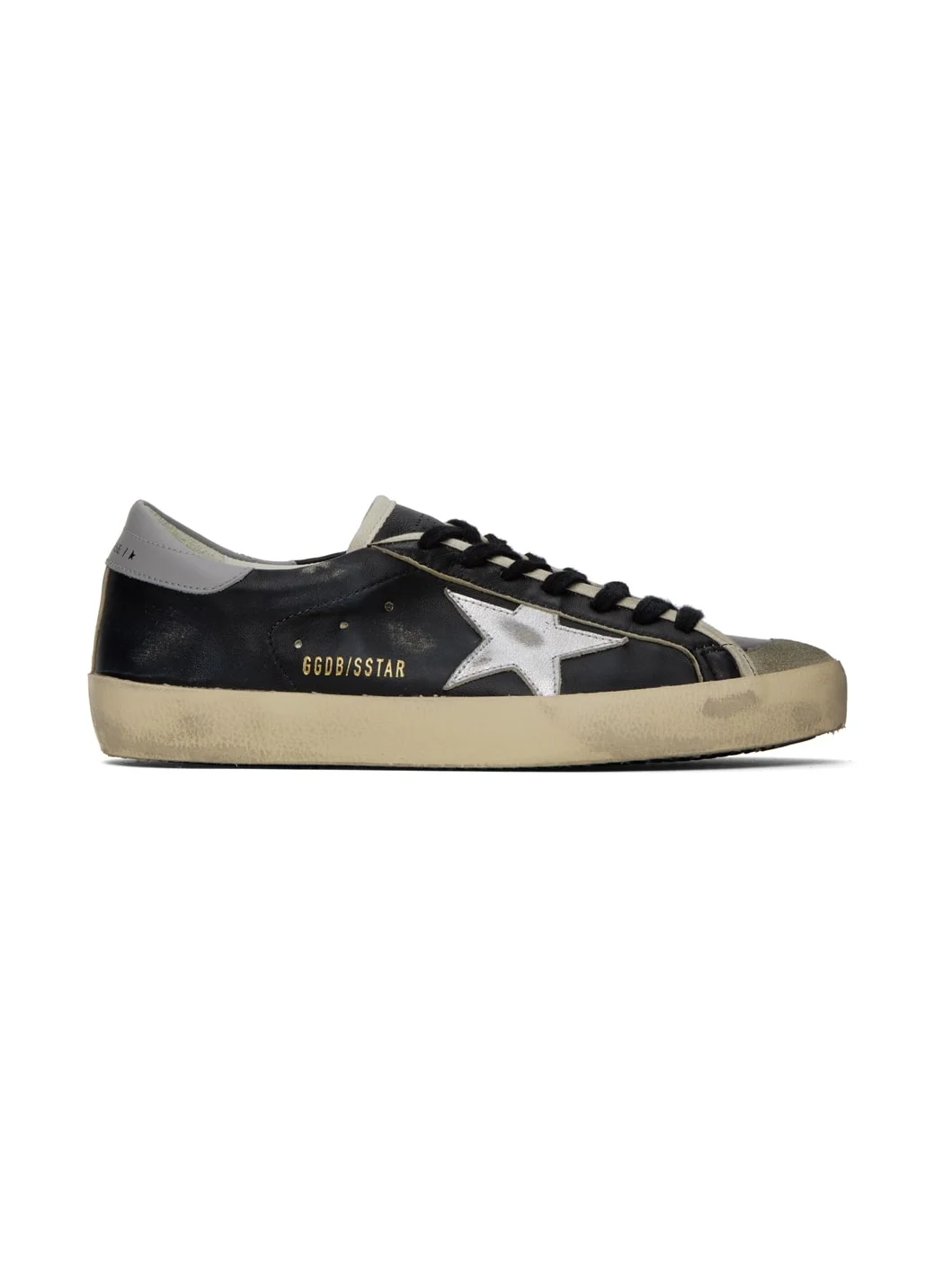 Handcrafted low-top buffed nappa leather and suede sneakers in black. Smudging throughout. · Lace-up closure · Perforated logo at tongue · Padded collar · Perforated detailing at sides · Signature star appliqué and logo stamp at outer side · Logo printed at heel tab · Buffed leather and terrycloth lining · Treaded rubber sole Supplier color: Black/Taupe/Silver