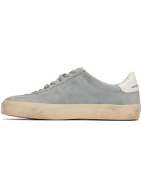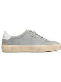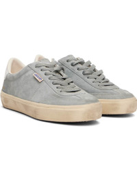 Handcrafted low-top suede sneakers in gray. · Smudging and subtle distressing throughout · Lace-up closure · Logo embossed at padded tongue · Padded collar · Logo flag and stamp at outer side · Logo printed at buffed leather heel tab · Buffed faux-leather and terrycloth lining · Treaded rubber sole Supplier color: Grey/White Upper: leather. Sole: rubber. Made in Italy 251264F128076