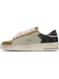 Handcrafted low-top paneled grained leather and suede sneakers in multicolor. · Smudging and grosgrain trim throughout · Perforations at toe and inner sides · Lace-up closure · Logo flag at padded tongue · Padded collar · Logo stamp and star applique at outer side · Logo stamp at heel tab · Grained leather and terrycloth lining · Logo printed at midsole · Treaded rubber sole Supplier color: Brown/Grey/Black Upper: leather. Sole: rubber. Made in Italy 251264M237019