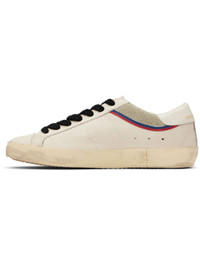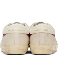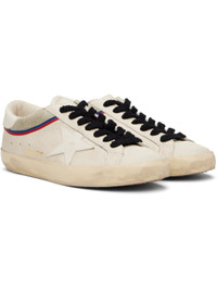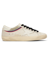 Low-top grained leather and suede sneakers in off-white. · Smudging and distressing throughout · Textured rubber cap toe · Lace-up closure · Perforated logo at tongue · Padded collar · Logo applique at sides · Perforations at sides · Gold-tone logo stamp at heel tab · Mesh and terrycloth lining · Treaded rubber sole Supplier color: White/Grey Upper: leather. Sole: rubber. Made in Italy 251264M237075
