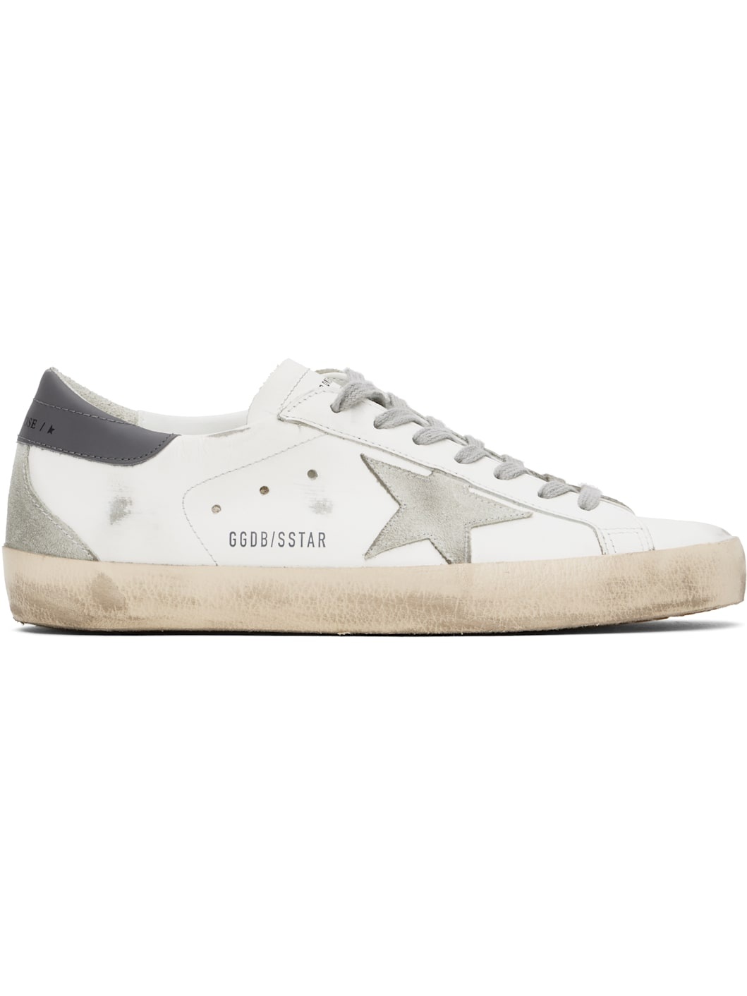Handcrafted low-top paneled buffed leather and suede sneakers in white and gray. · Distressing and smudging throughout · Lace-up closure · Logo stamp at tongue · Padded collar · Signature star applique at outer side · Logo stamp at outer side · Perforated detailing at sides · Logo stamp at heel tab · Buffed leather, suede, and terrycloth lining · Textured rubber midsole · Treaded rubber sole Supplier color: White/Ice/Dark gray Upper: leather. Sole: rubber. Made in Italy 251264M237014