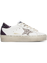 Handcrafted low-top grained leather sneakers in white. · Logo-printed lace-up closure · Logo flag at tongue · Padded collar · Perforations at sides · Logo stamp and glittered star applique at outer side · Logo stamp at glittered heel tab · Grained leather and terrycloth lining · Treaded rubber sole Supplier color: White/Cinder/Cabarnet Upper: leather. Sole: rubber. Made in Italy 251264F128072