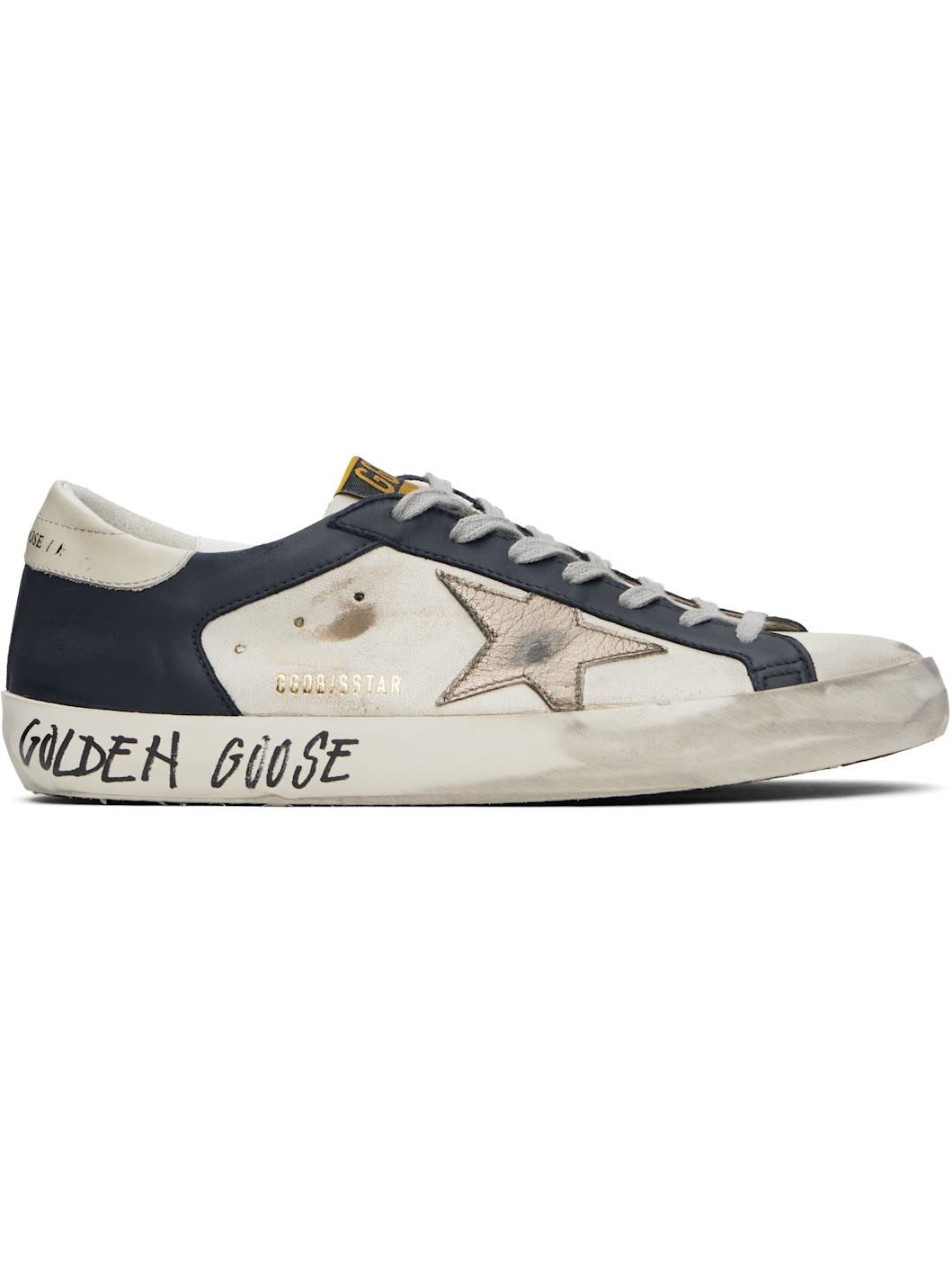 Handcrafted low-top buffed leather and nappa lambskin sneakers in white and navy. · Smudging and subtle distressing throughout · Lace-up closure · Logo flag at tongue · Padded collar · Perforations at sides · Star applique and logo stamp at outer side · Logo printed at heel tab and midsole · Suede, buffed faux-leather, and terrycloth lining · Treaded rubber sole Supplier color: White/Dark blue/Gun metal Upper: leather, lambskin. Sole: rubber. Made in Italy 251264M237015