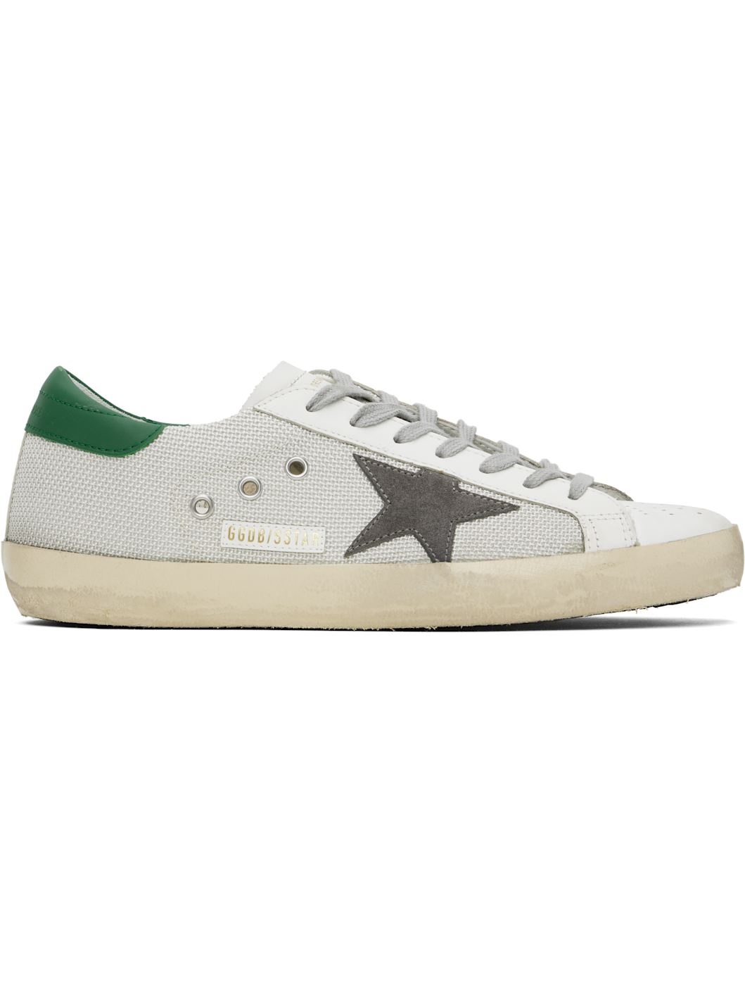 Low-top buffed leather and mesh sneakers in white, silver tone, and green. · Distressing and smudging throughout · Perforations at toe · Lace-up closure · Logo patch at tongue · Padded collar · Signature star applique at outer side · Logo stamp at outer side · Metal eyelets at sides · Text embossed at heel tab · Buffed leather, suede, and terrycloth lining · Textured rubber midsole · Treaded rubber sole Supplier color: Light silver/White/Gray/Green Upper: leather, textile. Sole: rubber. Made in Italy 251264M237008