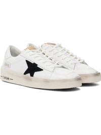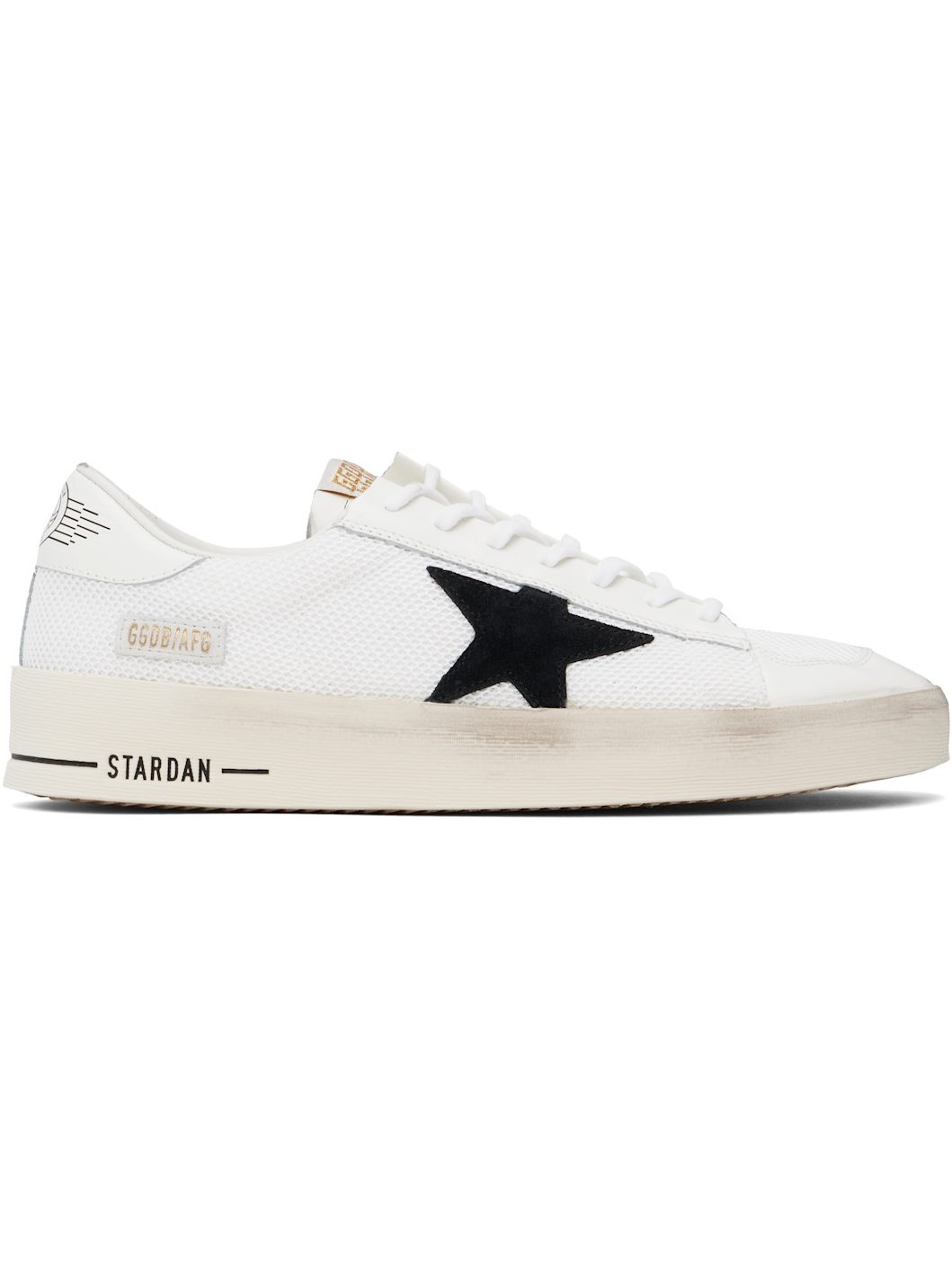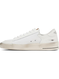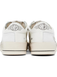 Handcrafted low-top buffed leather and mesh sneakers in white. · Smudging throughout · Lace-up closure · Logo patch at padded tongue · Padded collar · Star applique and logo stamp at outer side · Metal eyelets at inner side · Logo graphic printed at heel tab · Terrycloth, suede, and buffed leather lining · Treaded rubber sole Supplier color: White/Black Upper: leather, textile. Sole: rubber. Made in Italy 251264M237047
