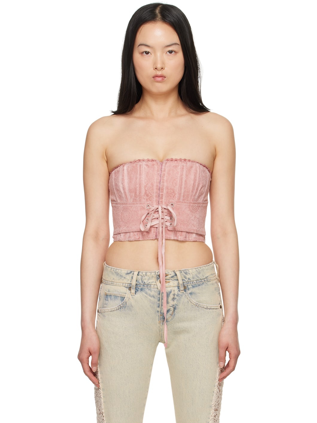 Stretch cotton damask corset. Hand-distressing, hand-fading, boning, and jacquard graphic pattern throughout. · Broderie anglaise trim at straight neck · Hook-eye fastening and lace-up detailing at front · Zip closure at side · Full viscose satin lining Supplier color: Faded rose multi Body: 97% cotton, 3% spandex. Lining: 100% viscose. Made in Italy 241603F111006