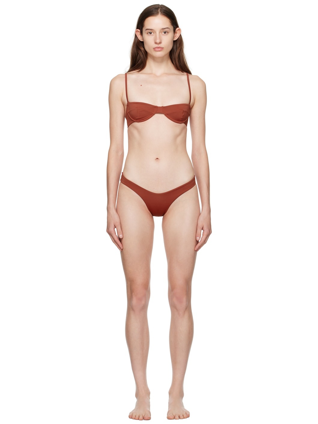 Stretch nylon jersey bikini top. · Sweetheart neck · Darts at chest · Underwire at cups · Adjustable shoulder straps · Tab-slot closure at back · Fully lined Stretch nylon jersey bikini bottoms. Fully lined. Supplier color: Bordeaux 87% polyamide, 13% elastane. Made in Brazil 241207F105001