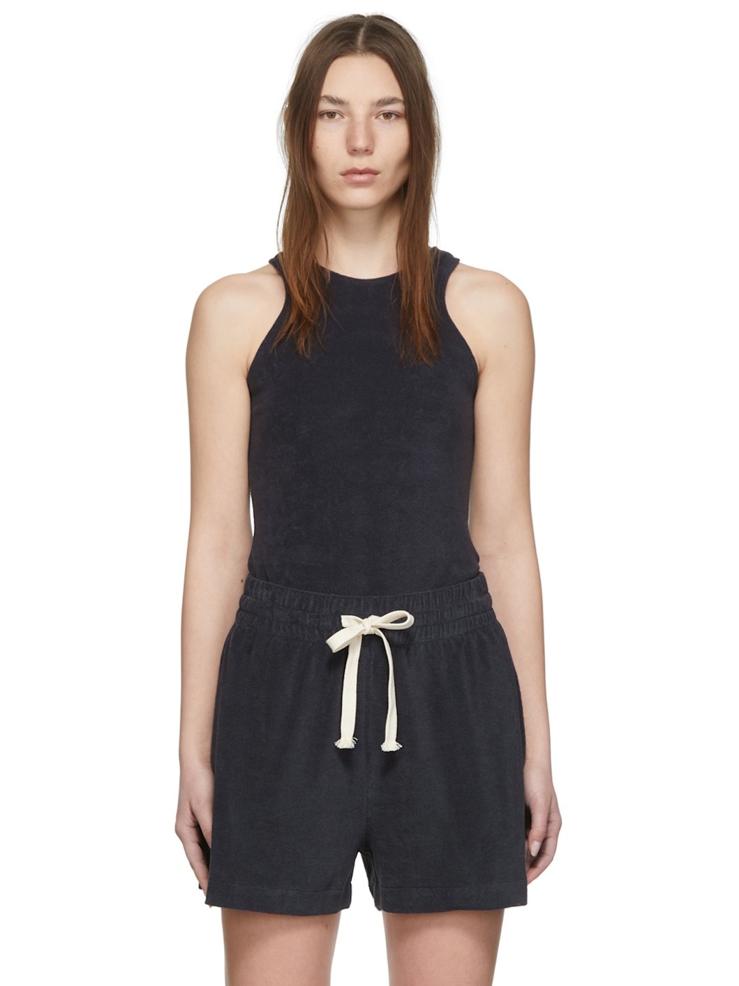 Sleeveless cotton and nylon-blend terrycloth bodysuit in navy. Logo embroidered in white at back collar. · Crewneck collar · Press-stud closure at bottom · Cut-out at back Supplier color: Navy 80% cotton, 20% nylon. Made in Italy 221242F358001