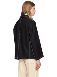 Hand-woven linen hopsack jacket. · Beaded floral appliques at spread collar and chest · Button closure · Patch pockets · Contrast stitching in white Supplier color: Black 100% linen. Made in India 251245M180000