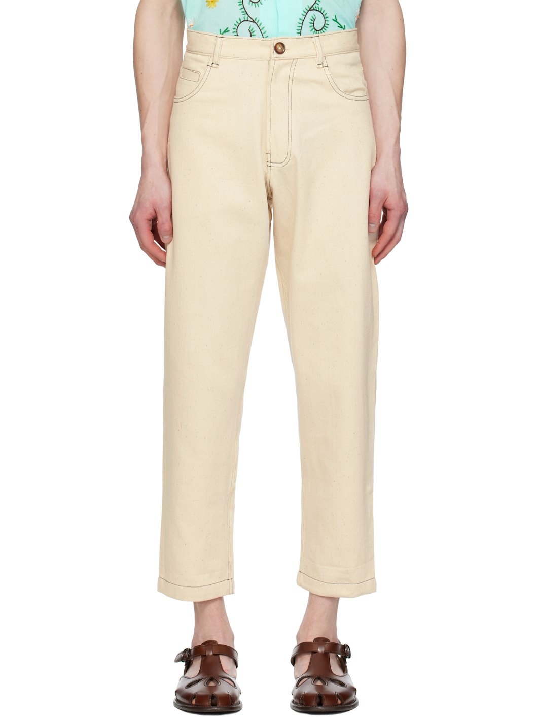 Hand-woven cotton twill trousers. Pilling throughout. · Belt loops · Five-pocket styling · Zip fly · Contrast stitching in black Supplier color: Off white 100% cotton. Made in India 251245M186000