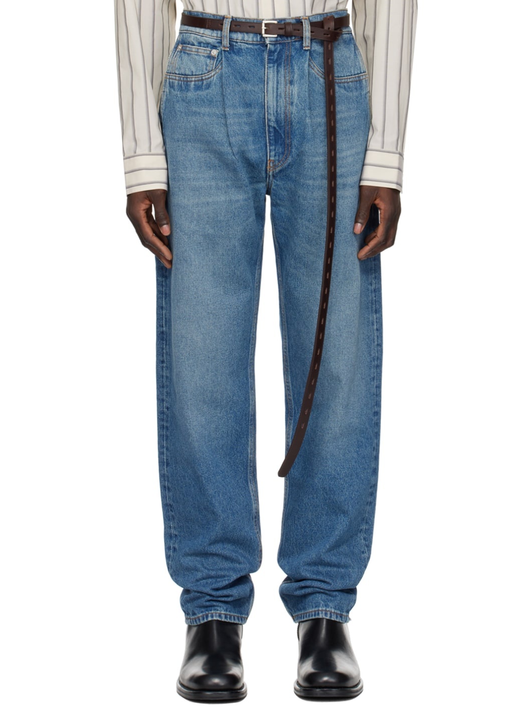 Heavyweight non-stretch denim jeans. Fading and whiskering throughout. · Belt loops · Five-pocket styling · Zip-fly · Pleats at front · Jacron logo patch at back waistband · Contrast stitching in orange Supplier color: Open blue 100% cotton. Made in Italy 241897M186001