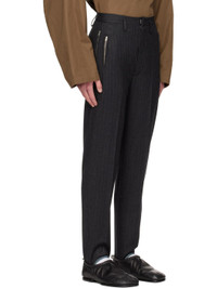Virgin wool twill trousers. Stripes throughout. · Belt loops · Five-pocket styling · Zip-fly · Twin darts at front and back · Central creases at front and back · Stirrup at elasticized cuffs Supplier color: Gray pinstripe Body: 100% virgin wool. Lining: 100% cotton. Made in Italy 222897M191005