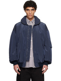 Padded crinkled taffeta bomber jacket. · Stowaway hood with bungee-style drawstring at shawl collar · Zip closure · Flap pockets at waist · Rib-knit hem and cuffs · Dropped shoulders · Utility pocket at sleeve · Welt pocket at interior · Full taffeta lining Supplier color: Navy blue Body: 100% polyamide. Fill: 50% wool, 50% polyester. Trim: 91% cotton, 7% polyamide, 2% elastane. Made in Italy 261897M175000