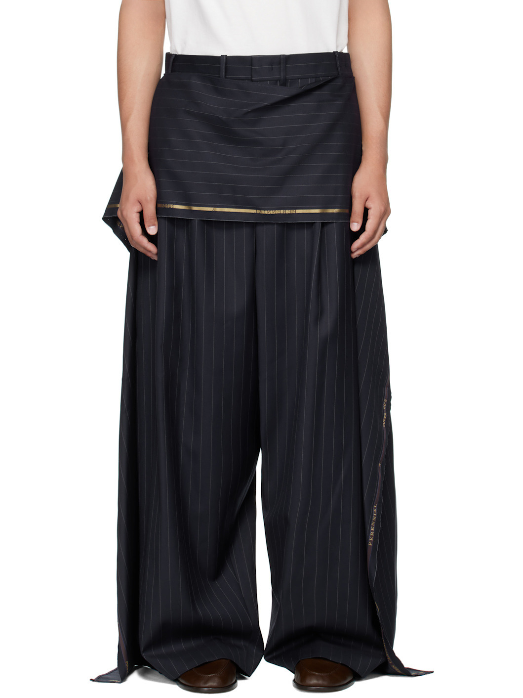 Super 110s wool flannel trousers. · Pinstripes and text woven throughout · Belt loops · Two-pocket styling · Zip fly · Draped overlay panel at waist and outseams · Darts at back Supplier color: Navy 100% wool. Made in Italy 252897M191000